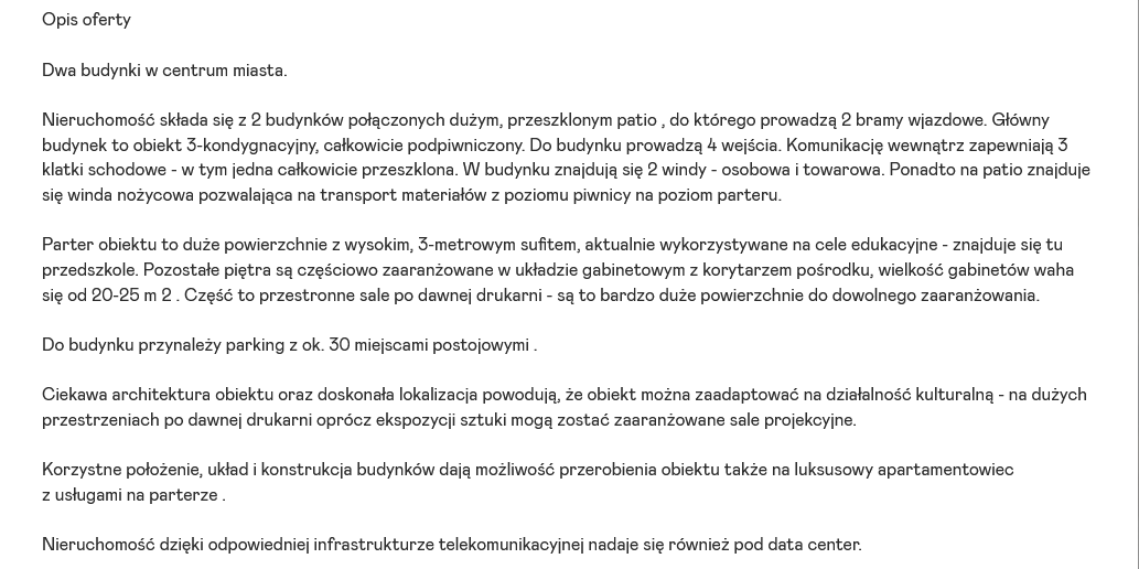 “Nieruchomość składa się z 2 budynków połączonych dużym, przeszklonym patio, do którego prowadzą 2 bramy wjazdowe. Główny budynek to obiekt 3-kondygnacyjny, całkowicie podpiwniczony. Do budynku prowadzą 4 wejścia. Komunikację wewnątrz zapewniają 3 klatki schodowe – w tym jedna całkowicie przeszklona. W budynku znajdują się 2 windy – osobowa i towarowa. Ponadto na patio znajduje się winda nożycowa pozwalająca na transport materiałów z poziomu piwnicy na poziom parteru.
